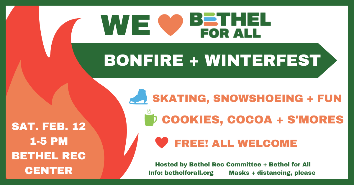 Come share the Bethel love and spend a fun day outdoors on Sat. Feb. 12. Stop by anytime 1-5 PM for free, fun, family-friendly activities. The Bethel Recreation Committee and Bethel for All are teaming up to host this event. Join us to learn more about our work and upcoming activities, share your ideas about creating a more accessible and vibrant Bethel, and weigh in on your priorities for projects this spring and summer.